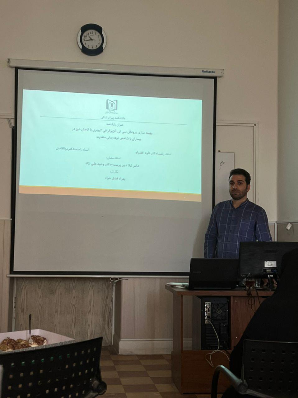 جلسه دفاع از پایان نامه کارشناسی ارشد فناوری تصویربرداری پزشکی آقای بهزاد فضل خواه با عنوان "بهینه سازی پروتکل سی تی آنژیوگرافی کرونری با کاهش دوز در بیماران با شاخص توده بدنی متفاوت" با راهنمایی آقای دکتر داود خضرلو و خانم دکتر منا فاضل قاضیانی و مشاوره خانم دکتر لیلا دین پرست و آقای دکتر وحید علی نژاد در روز یکشنبه مورخ 1401/6/13 در دانشکده پیراپزشکی برگزار شد.